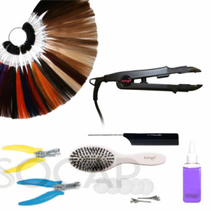 Inhalt: 1 Wärmezange, 1 Kompressionszange (2,5 mm; 4 mm oder 6 mm), 1 Entfernerzange, 1 Remover (7,60 EUR inkl. MwSt. / 100 ml), 1 Profibürste groß, 1 Echthaarfarbring mit 43 Farben, 5 Abstandshalter + 2 Klemmen, 1 Abteilkamm